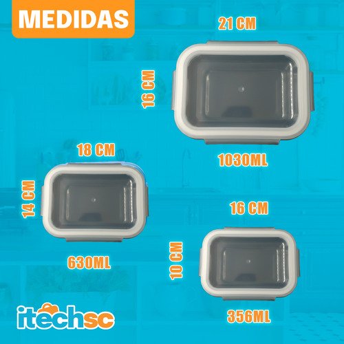 Conteúdo do Kit: 01 Pote Hermético 370ml + 01 Pote Hermético 640ml + 01 Pote Hermético 1050ml.