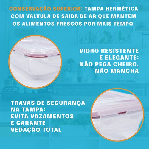 Feito em vidro borossilicato, este pote é extremamente resistente a choques térmicos. O sistema de fechamento com 4 travas reforçadas e anel de silicone garante que nada saia e nada entre, protegendo seus alimentos de bactérias e evitando vazamentos, mesmo com líquidos.