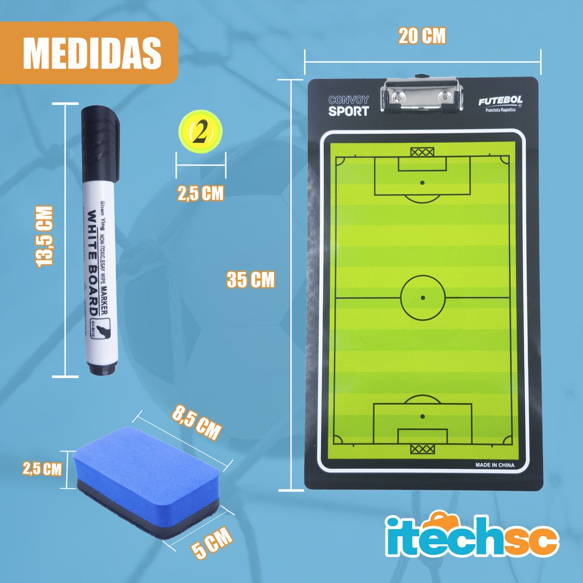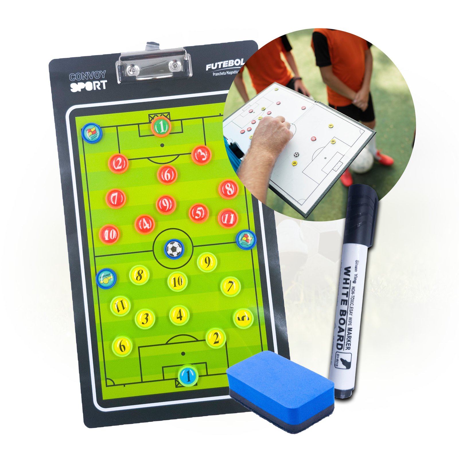 Leve a organização do seu time para o próximo nível com a Prancheta Tática Magnética Profissional. Essencial para treinadores e auxiliares técnicos, esta prancheta foi projetada para facilitar a explicação de jogadas ensaiadas, posicionamentos e estratégias de jogo de forma visual e clara.